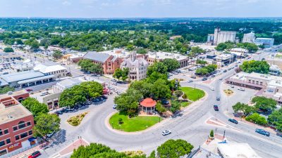 Section of the downtown square in San Marcos, Texas. Not far from Austin, San Marcos is the county seat of Hays County.